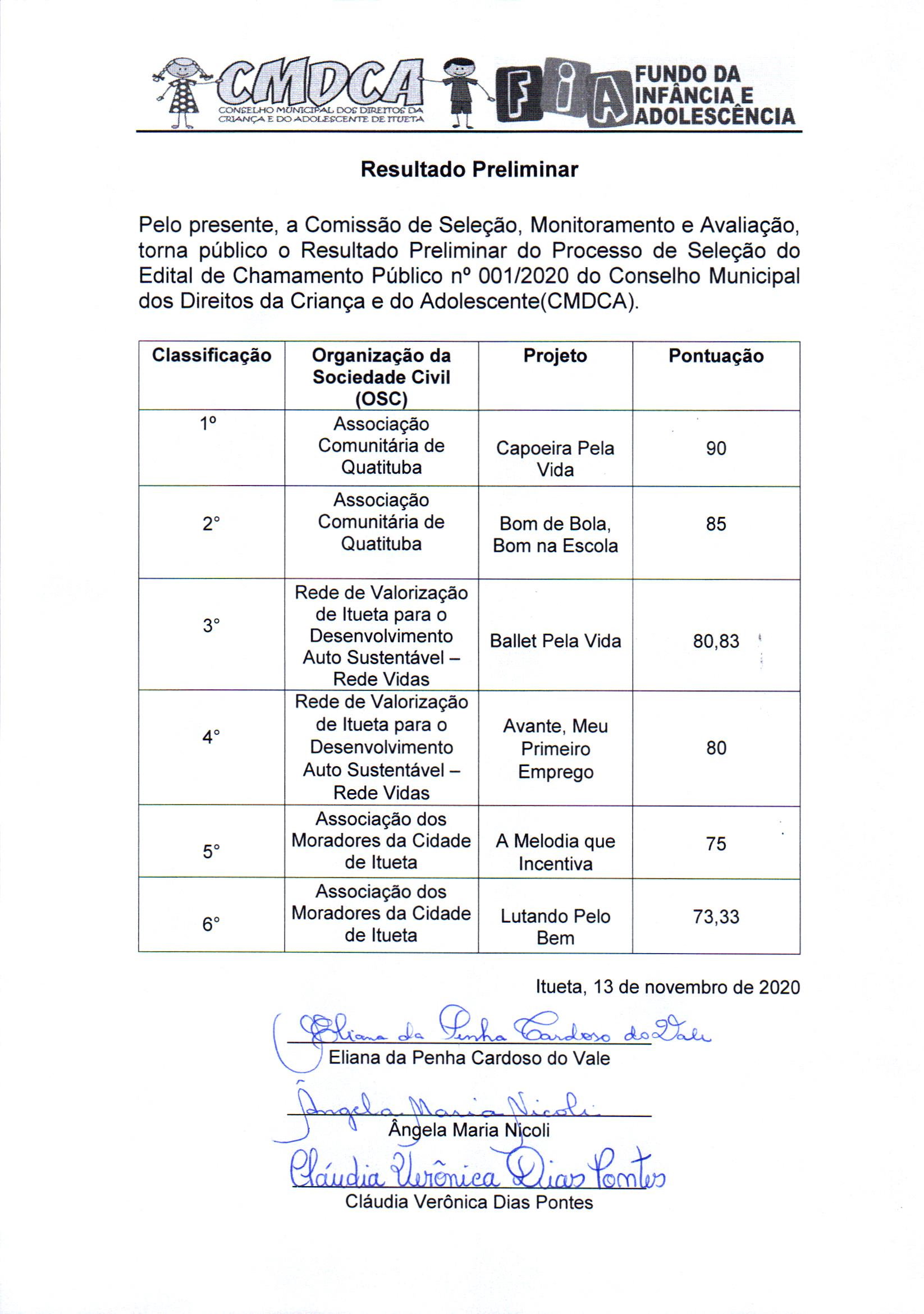 O MUNICÍPIO DE ITUETA, situado na Praça Antônio Barbosa de Castro, nº. 35, Centro, CEP nº. 35.220-000, por intermédio do Conselho Municipal dos Direitos da Criança e do Adolescente - CMDCA, com esteio na Lei Federal nº 13.019, de 31 de julho de 2014, torna público o presente RESULTADO PRELIMINAR DO PROCESSO DE SELEÇÃO - EDITAL DE CHAMAMENTO PÚBLICO DE COLABORAÇÃO do Edital de Chamamento Público visando à seleção de propostas de Organizações da Sociedade Civil interessadas em celebrar Termo de Fomento que tem por objeto a execução de projetos com as atividades relacionadas no edital 001/2020.
