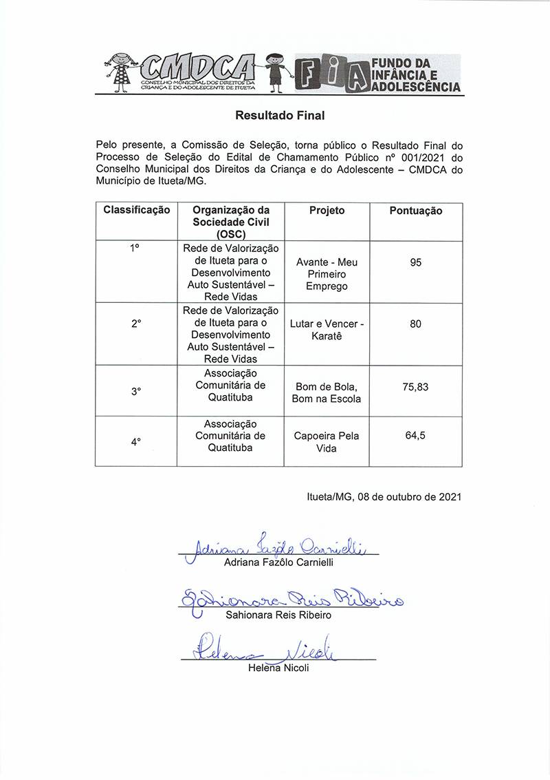 A Prefeitura Municipal de Itueta, por intermédio do Conselho Municipal dos Direitos da Criança e Adolescente (CMDCA) e do Fundo da Infância e Adolescência (FIA), divulga o Resultado Final - Edital de Chamamento Público – CMDCA – N° 001/2021.