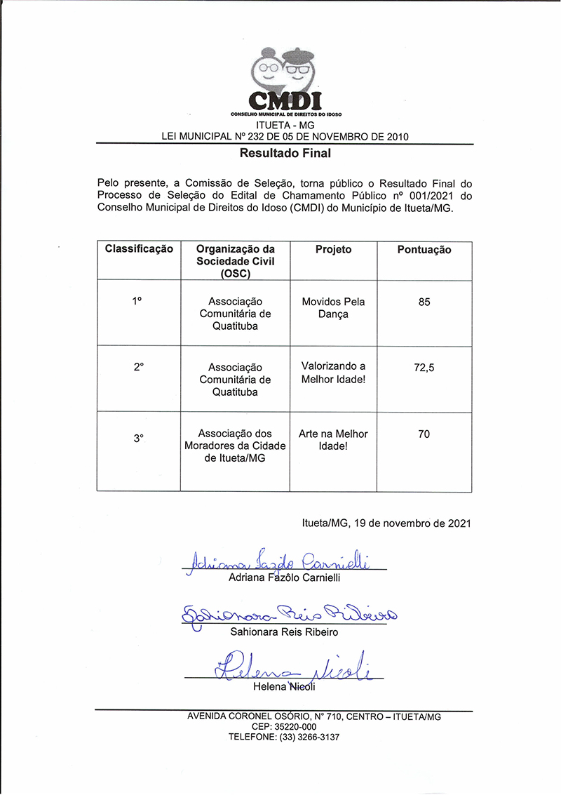 A PREFEITURA MUNICIPAL DE ITUETA-MG, por intermédio do Conselho Municipal de Direitos do Idoso – CMDI, com esteio na Lei Federal nº 13.019, de 31 de julho de 2014, torna público o presente RESULTADO FINAL do Edital de Chamamento Público visando à seleção de propostas de organizações da sociedade civil interessadas em celebrar Termo de Fomento que tem por objeto a execução de projetos com as atividades relacionadas no edital.