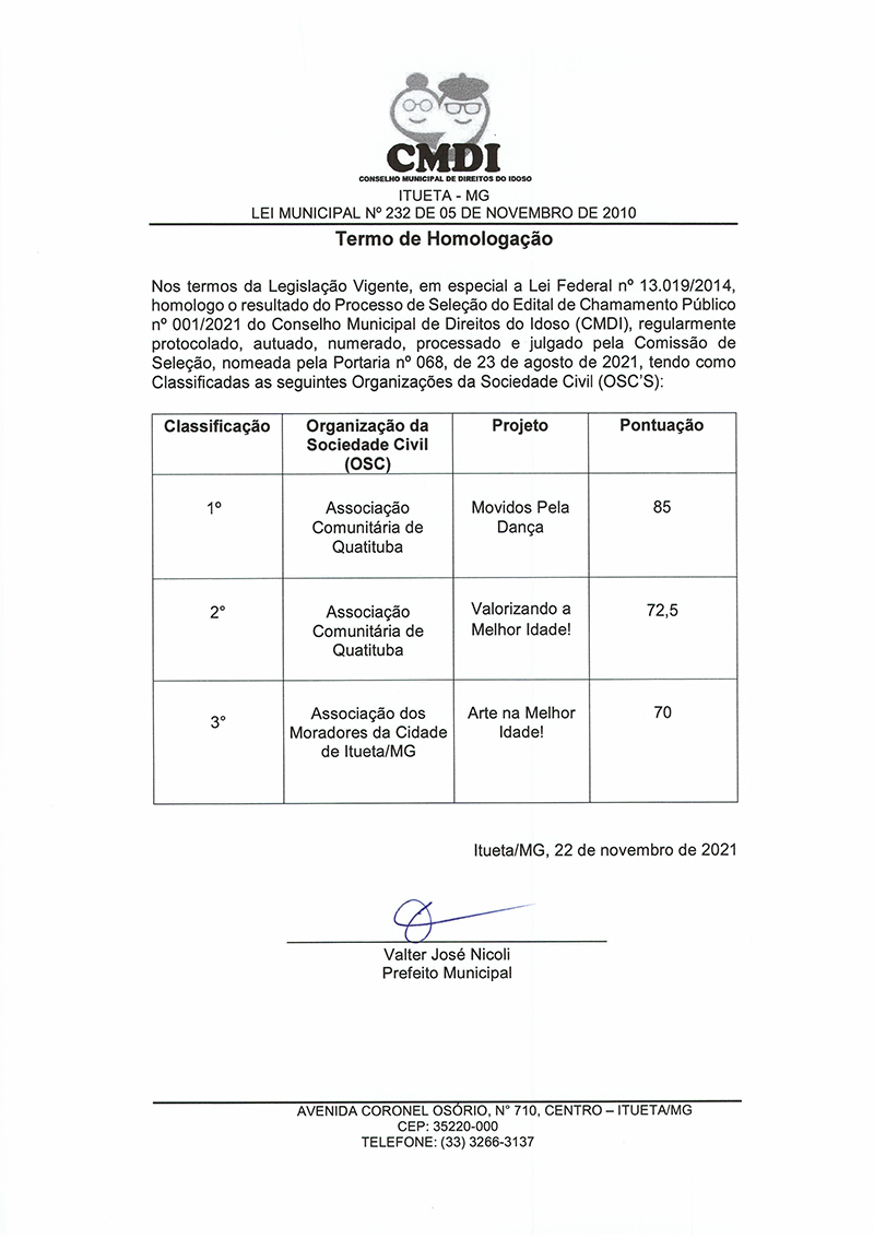 Página inicial > Últimas Notícias > Termo de Homologação Edital de Chamamento Público 001/2021 (CMDI)