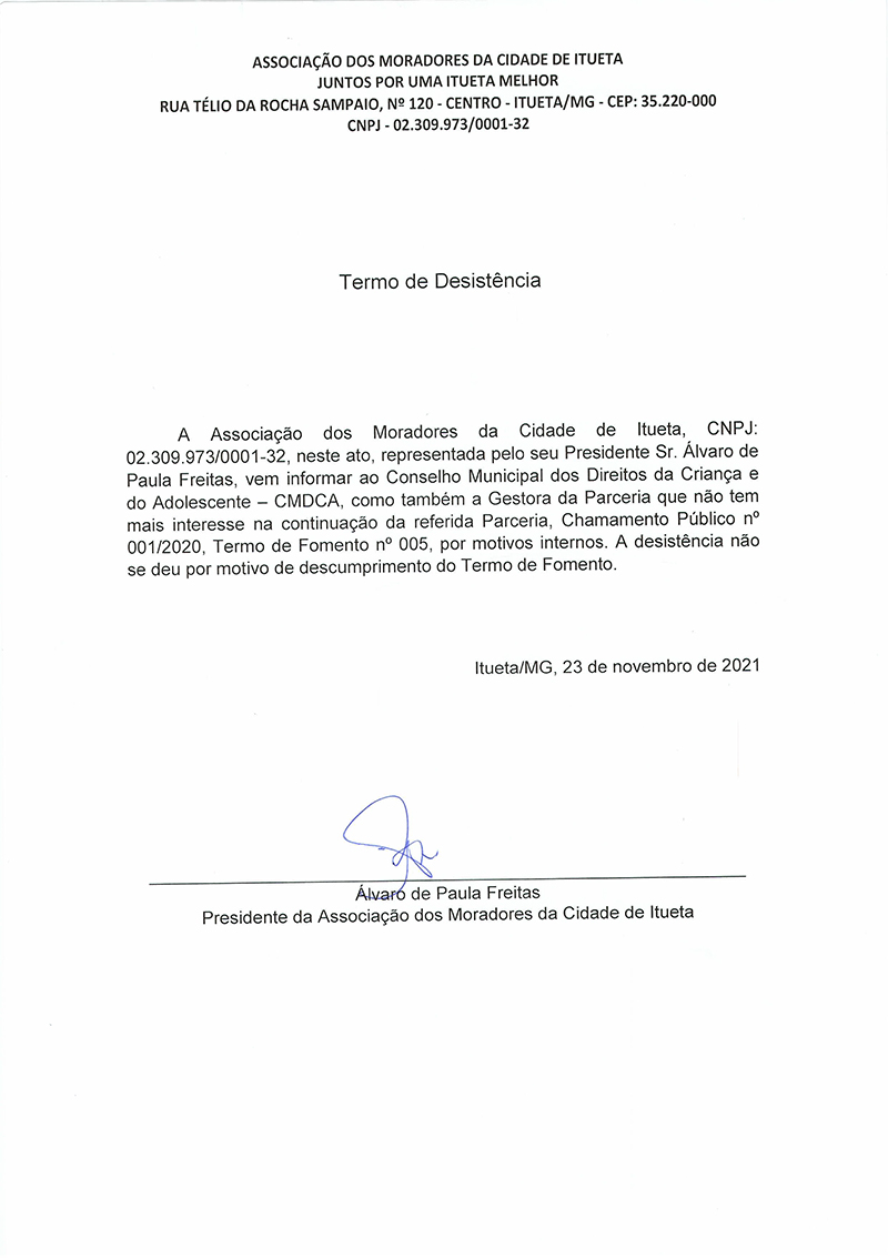 O MUNICÍPIO DE ITUETA, situado na Praça Antônio Barbosa de Castro, nº. 35, Centro, CEP nº. 35.220-000, por intermédio do Conselho Municipal dos Direitos da Criança e do Adolescente - CMDCA, torna público o presente TERMO DE DESISTÊNCIA - Termo de Fomento nº 005 - Edital de Chamamento Público 001/2020.