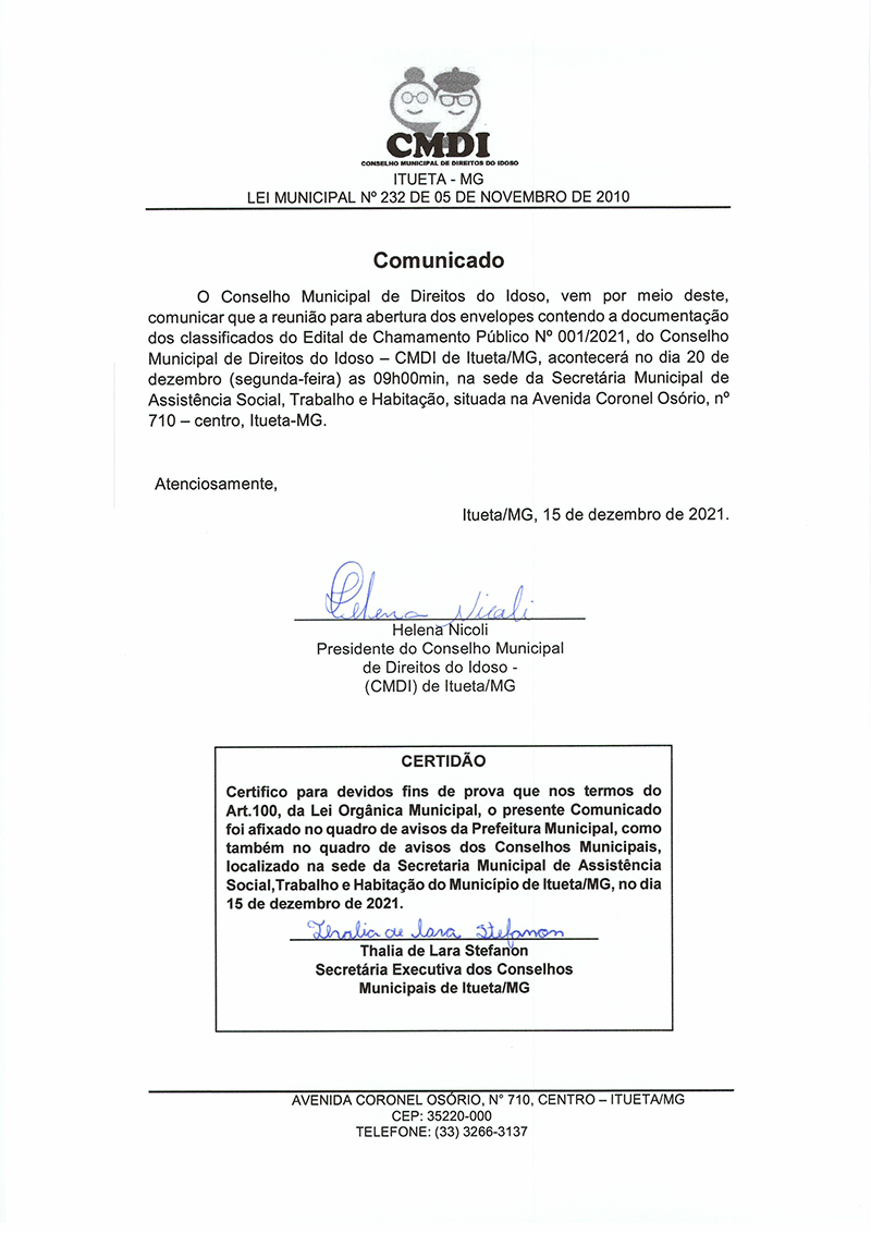 A PREFEITURA MUNICIPAL DE ITUETA-MG, por intermédio do Conselho Municipal de Direitos do Idoso – CMDI, torna público o presente COMUNICADO: