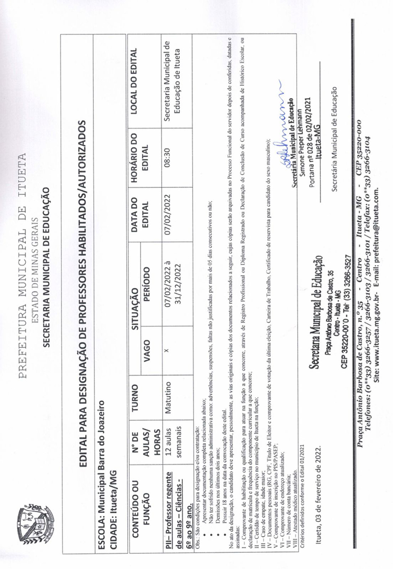 Edital para designação de professores habilitados/autorizados - CIÊNCIAS
