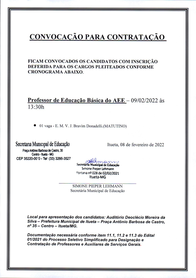 CONVOCAÇÃO PARA CONTRATAÇÃO - Professor de Educação Básica do AEE - Processo Seletivo Simplificado - Edital nº 01/2021