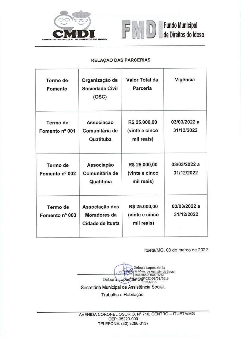 O MUNICÍPIO DE ITUETA, situado na Praça Antônio Barbosa de Castro, nº. 35, Centro, CEP nº. 35.220-000, por intermédio da Secretaria Municipal de Assistência Social, Trabalho e Habitação - Conselho Municipal dos Direitos do Idoso - CMDI, Fundo Municipal de Direitos do Idoso - FMDI, torna público a presente RELAÇÃO DE PARCERIAS do Edital de Chamamento Público, das Organizações da Sociedade Civil que celebraram Termo de Fomento que tem por objeto a execução de projetos com as atividades relacionadas no edital.