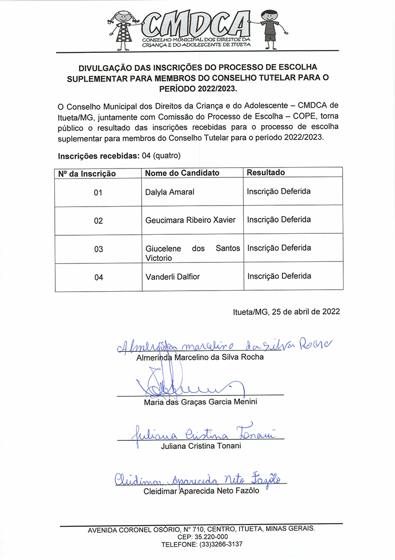 O Conselho Municipal dos Direitos da Criança e Adolescente (CMDCA) do Município de Itueta/MG, juntamente com a Comissão do Processo de Escolha - COPE, torna público o resultado das inscrições recebidas para o Processo de Escolha Suplementar para membros do Conselho Tutelar para o período 2022/2023.