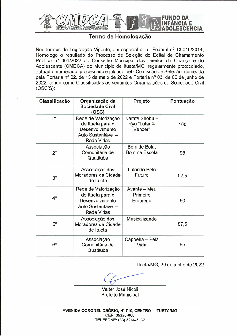 A PREFEITURA MUNICIPAL DE ITUETA-MG, por intermédio do Conselho Municipal de Direitos da Criança e do Adolescente – CMDCA, com esteio na Lei Federal nº 13.019, de 31 de julho de 2014, torna público o TERMO DE HOMOLOGAÇÃO do processo de seleção do Edital de Chamamento Público visando à seleção de propostas de organizações da sociedade civil interessadas em celebrar Termo de Fomento que tem por objeto a execução de projetos com as atividades relacionadas no edital.