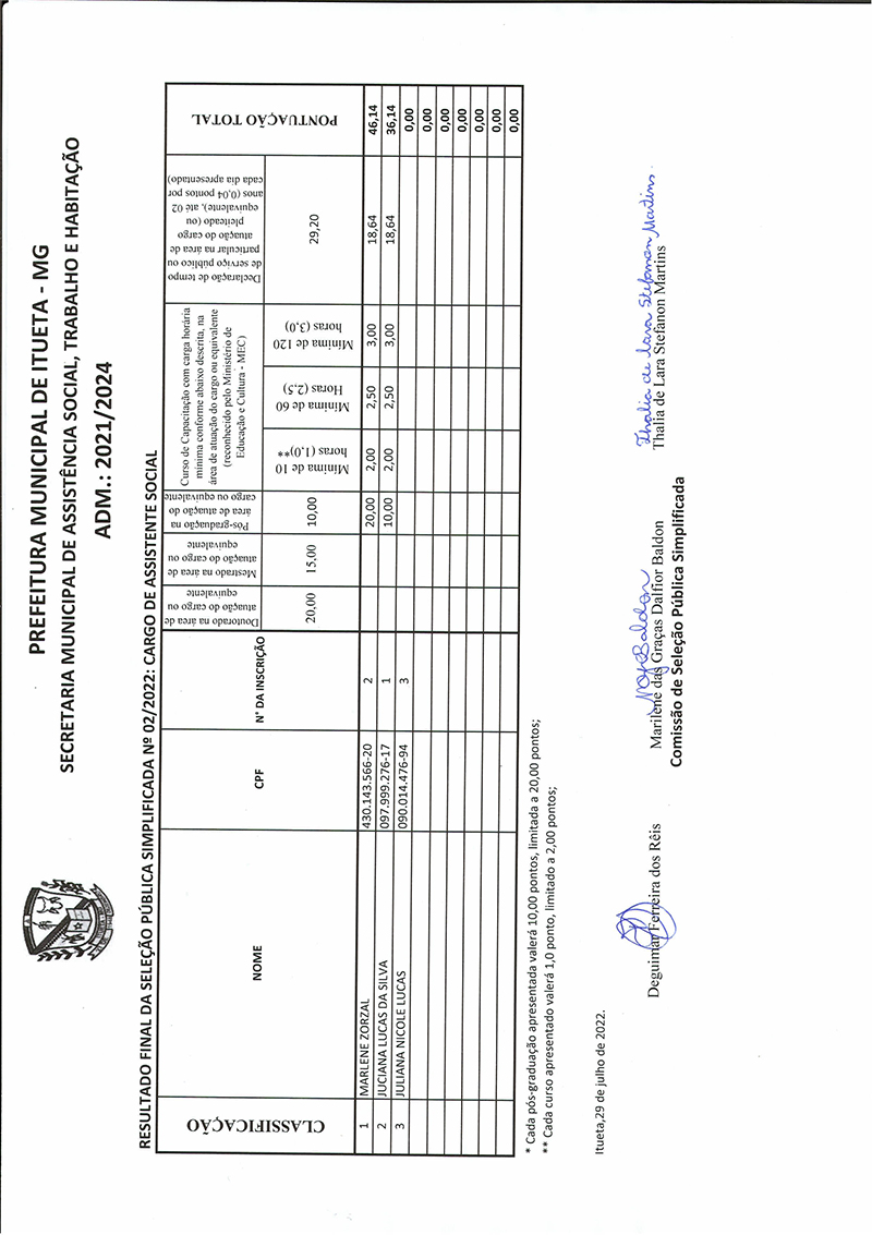 A Prefeitura Municipal de Itueta/MG, situada na Praça Antônio Barbosa de Castro, nº. 35, Centro, CEP nº. 35.220-000, por intermédio da Secretaria Municipal de Assistência Social, Trabalho e Habitação, no uso de suas atribuições legais, conferidas pela Lei Orgânica Municipal e Lei Complementar Municipal nº 002, de 04/04/2011, TORNA PÚBLICO, o RESULTADO FINAL das inscrições para o processo de SELEÇÃO PÚBLICA SIMPLIFICADA, para provimento de vagas existentes (ASSITENTE SOCIAL) de acordo com o requisito da Lei Municipal n° 240, de 03 de Maio de 2011 e suas posteriores alterações, e o artigo 37, IX da Constituição Federal relacionadas no edital.
