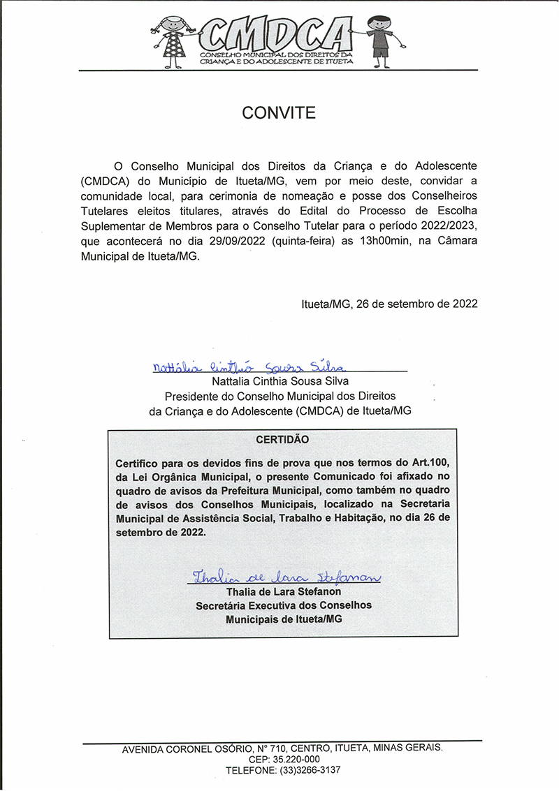 O Conselho Municipal dos Direitos da Criança e Adolescente (CMDCA) do Município de Itueta/MG, torna público o CONVITE PARA POSSE dos membros do Conselho Tutelar para o período 2022/2023.