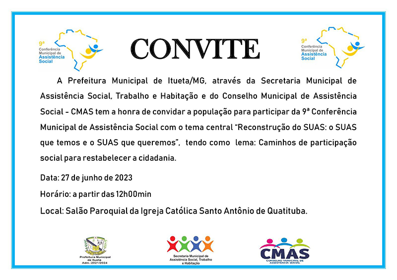 A Prefeitura Municipal de Itueta-MG, através da Secretaria Municipal de Assistência Social, Trabalho e Habitação e do Conselho Municipal de Assistência Social, tem a honra de convidar a população para participar da 9ª Conferência Municipal de Assistência Social de Itueta, com o tema central “Reconstrução do SUAS: o SUAS que temos e o SUAS que queremos”, tendo como lema: Caminhos de participação social para restabelecer a cidadania.