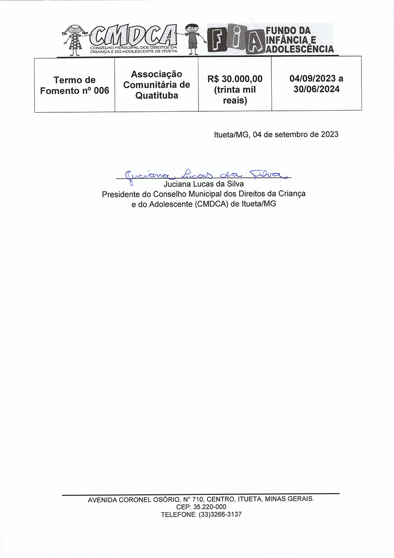 MUNICÍPIO DE ITUETA, situado na Praça Antônio Barbosa de Castro, nº. 35, Centro, CEP nº. 35.220-000, por intermédio da Secretaria Municipal de Assistência Social, Trabalho e Habitação - Conselho Municipal dos Direitos da Criança e do Adolescente - CMDCA, torna público a presente RELAÇÃO DE PARCERIAS do Edital de Chamamento Público, das Organizações da Sociedade Civil que celebraram Termo de Fomento que tem por objeto a execução de projetos com as atividades relacionadas no edital.