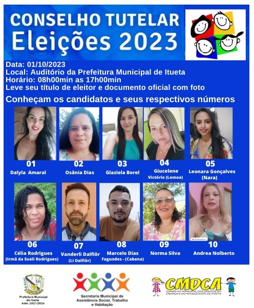A PREFEITURA MUNICIPAL DE ITUETA-MG, por intermédio do Conselho Municipal de Direitos da Criança e do Adolescente – CMDCA, torna público a Divulgação DOS CANDIDATOS E SEUS RESPECTIVOS NÚMEROS a participarem da eleição do Edital do processo de escolha de membros para o Conselho Tutelar do município de Itueta/MG, quadriênio 2024/2028.