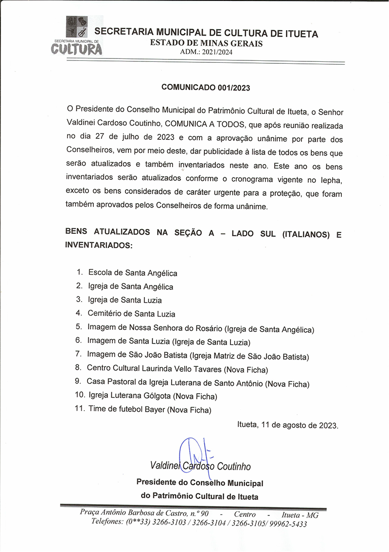 O Presidente do Conselho Municipal do Patrimônio Cultural de Itueta/MG torna público, para conhecimento de todos quantos possam se interessar: