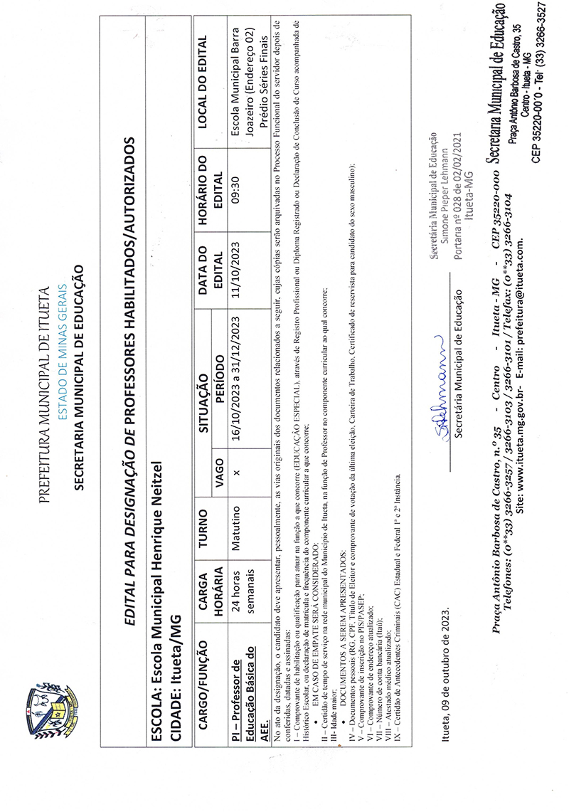 Edital para designação de professores habilitados / autorizados - PI - Professor de Educação Básica do AEE (EMHN)