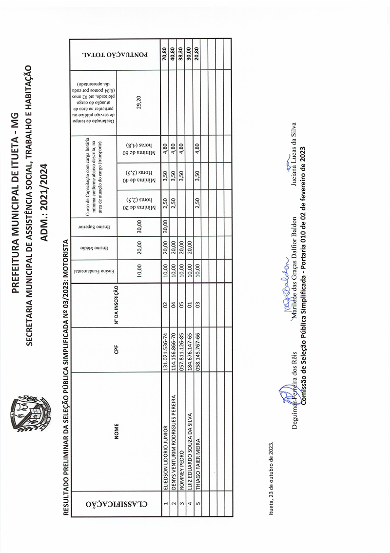 A Prefeitura Municipal de Itueta/MG, situada na Praça Antônio Barbosa de Castro, nº. 35, Centro, CEP nº. 35.220-000, por intermédio da Secretaria Municipal de Assistência Social, Trabalho e Habitação, no uso de suas atribuições legais, conferidas pela Lei Orgânica Municipal e Lei Complementar Municipal nº 002, de 04/04/2011, TORNA PÚBLICO, o RESULTADO PRELIMINAR do processo de SELEÇÃO PÚBLICA SIMPLIFICADA, para provimento de vagas existentes (MOTORISTA) de acordo com o requisito da Lei Municipal n° 240, de 03 de Maio de 2011 e suas posteriores alterações, e o artigo 37, IX da Constituição Federal relacionadas nesse edital.