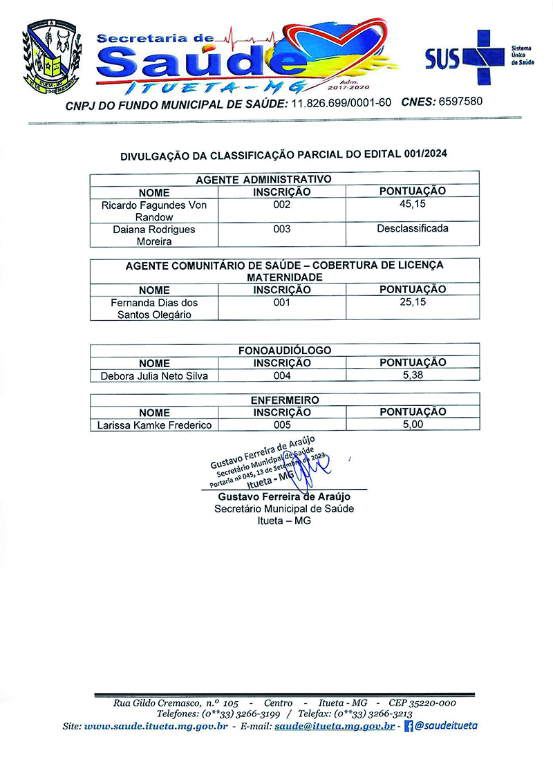 A Secretaria Municipal de Saúde de Itueta – MG, no uso de suas atribuições legais, conferidos pela Lei Orgânica Municipal e Lei Complementar Municipal nº 002, de 04 de abril de 2011, TORNA PÚBLICO, o RESULTADO DA CLASSIFICAÇÃO PARCIAL DO EDITAL.