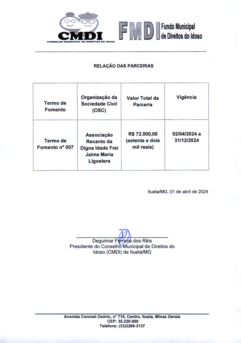 CMDI - Relação das Parcerias 2024 - Termo de Fomento nº 007