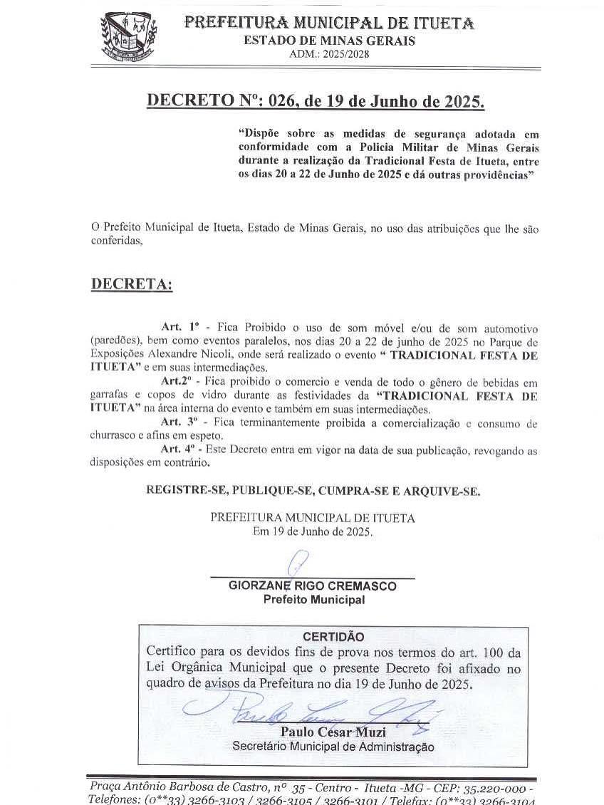 A Prefeitura Municipal de Itueta, por meio do Decreto nº 026, de 19 de junho de 2025, dispõe sobre as medidas de segurança a serem adotadas durante a Tradicional Festa de Itueta, que ocorrerá nos dias 20 a 22 de junho de 2025.