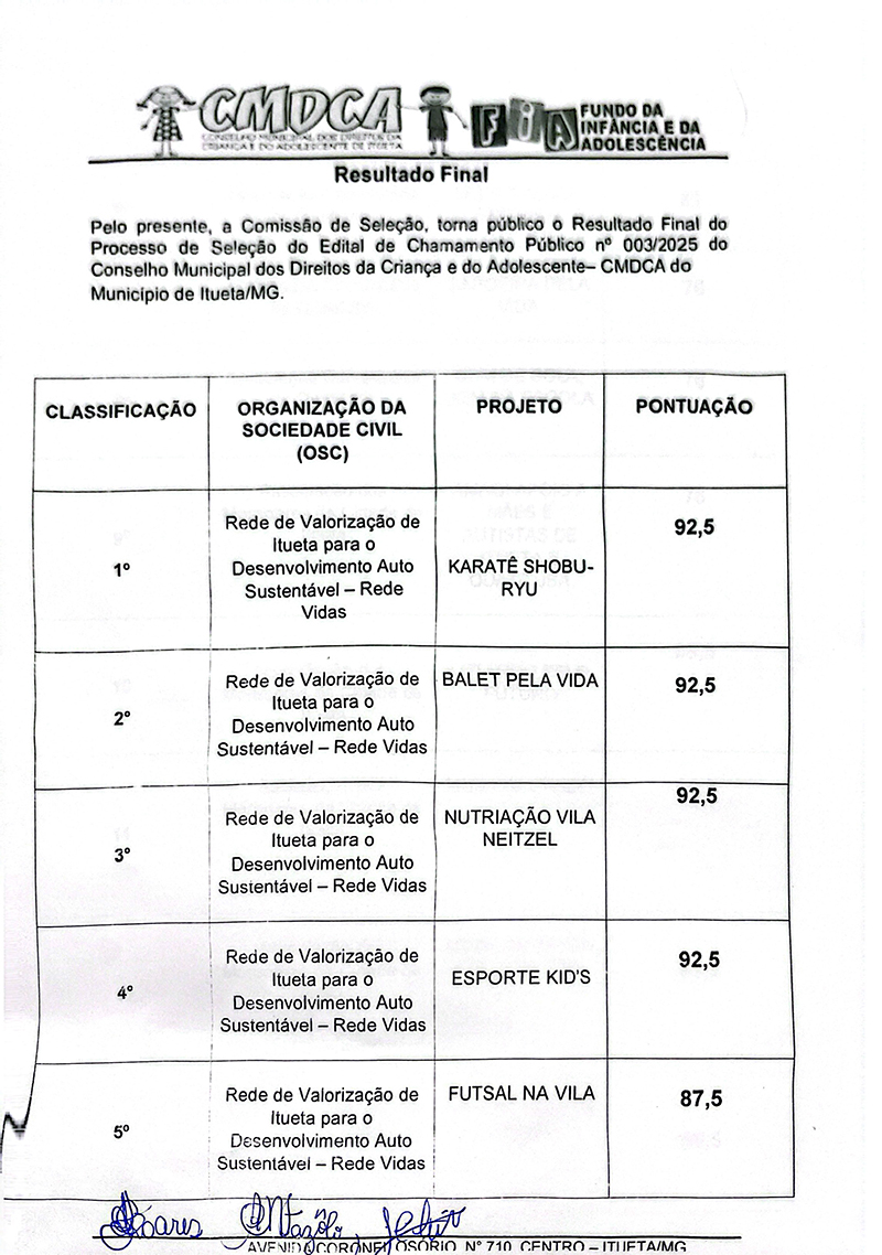 A PREFEITURA MUNICIPAL DE ITUETA-MG, por intermédio do Conselho Municipal de Direitos da Criança e do Adolescente – CMDCA, com esteio na Lei Federal nº 13.019, de 31 de julho de 2014, torna público o RESULTADO FINAL do processo de seleção do Edital de Chamamento Público visando à seleção de propostas de organizações da sociedade civil interessadas em celebrar Termo de Fomento que tem por objeto a execução de projetos com as atividades relacionadas no edital.