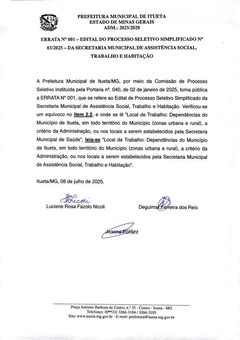 Página inicial > Últimas Notícias > ERRATA - Processo Seleção Pública Simplificada (Assistência Social) - Edital nº 03/2025