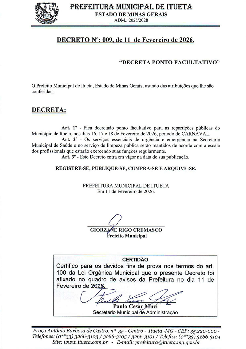 A Prefeitura Municipal de Itueta, Minas Gerais, decretou ponto facultativo para as repartições públicas do município para o dia 16, 17 e 18 de fevereiro de 2026.