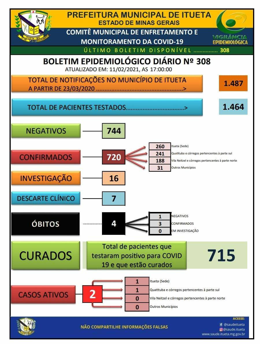 Hoje tivemos a inclusão de 01 caso positivo em Itueta (Sede).