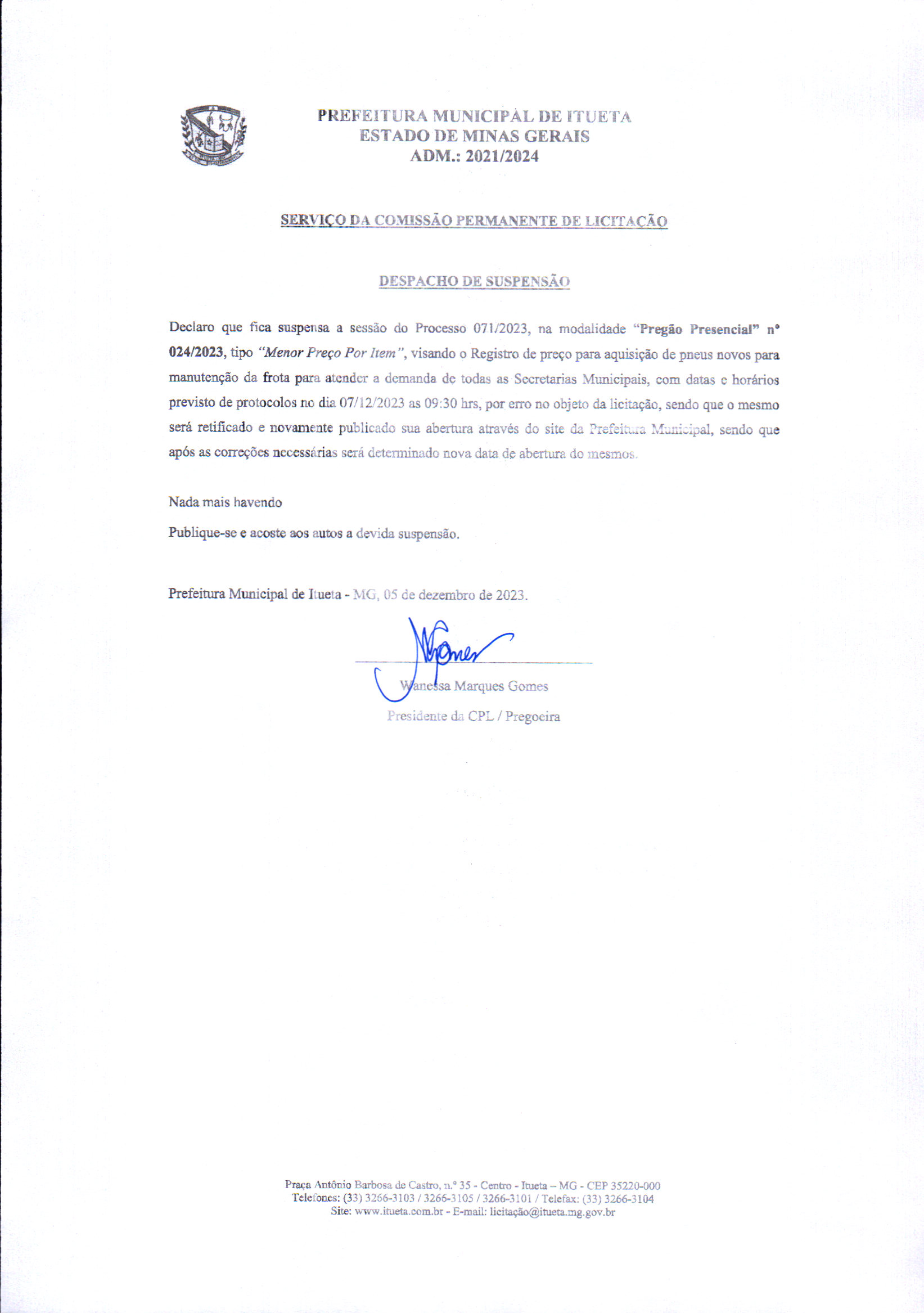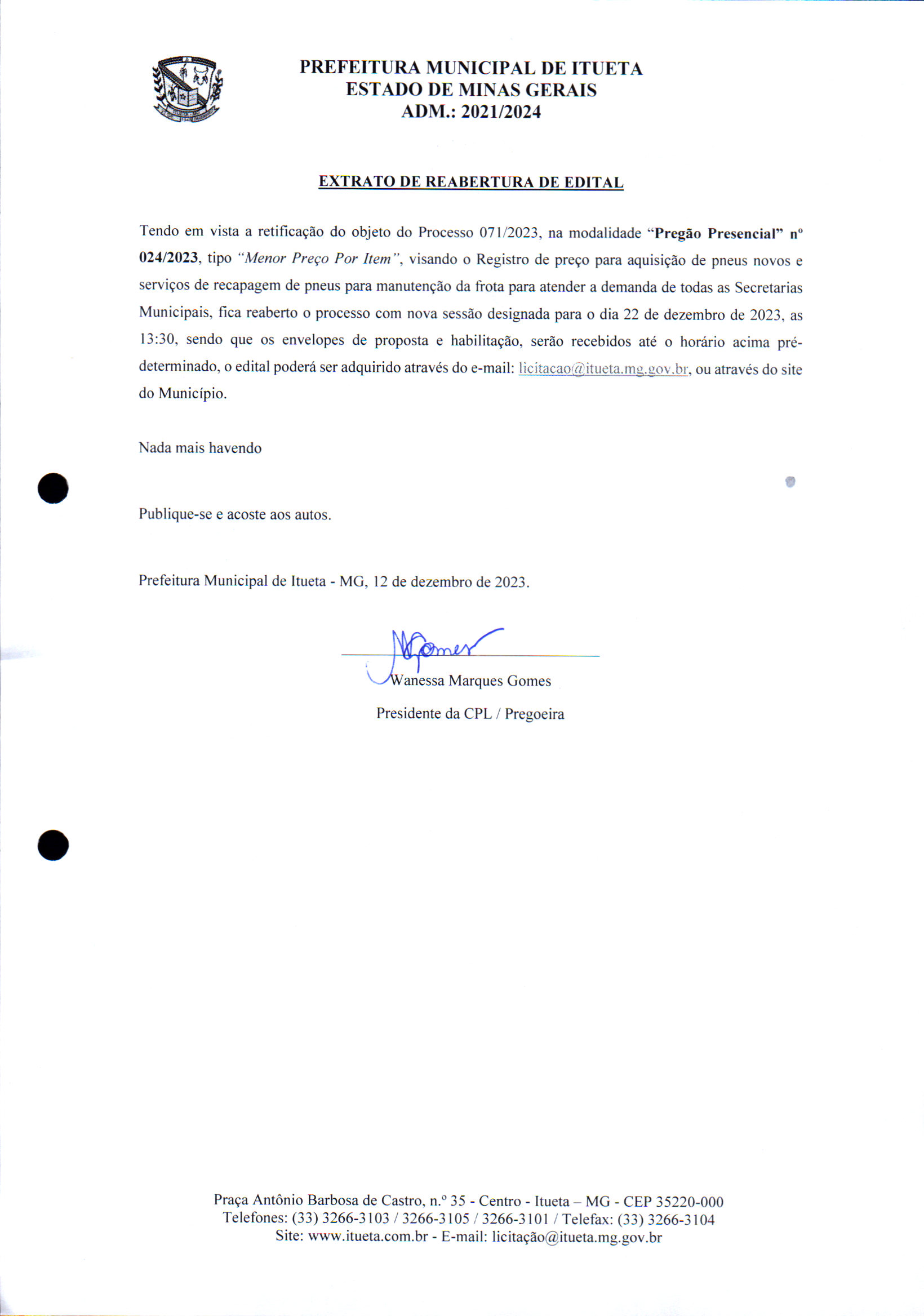Escrito por Setor de LicitaçõesPREFEITURA MUNICIPAL DE ITUETA – MG – PUBLICAÇÃO DE EXTRATO DE EDITAL nº. 74. Abertura do Processo de Licitação nº 011/2023, na modalidade “Pregão Presencial” nº 03/2023, tipo “Menor Preço Por Item”, para Registro de preço para futura aquisição de equipamentos de informática, moveis, e eletroeletrônicos para todas as Secretarias da Prefeitura Municipal de Itueta - MG, conforme descrito no Edital. Os envelopes Proposta e Habilitação deverão ser protocolados nesta prefeitura até o dia 05/04/23 os envelopes serão recebidos até as 09:00 hrs, a abertura dos envelopes Proposta e Habilitação ocorrerá no dia 05/04/23 as 09:00 hrs, na sala da Comissão Permanente de Licitação, o Edital 011/2023 encontra-se à disposição, na integra, aos interessados, na sede da Prefeitura Municipal. A presente licitação será processada e julgada em conformidade com a Lei Federal nº 10.520/02 e 8.666/93. Itueta/MG, 23 de março de 2023. Valter José Nicoli, Prefeito Municipal.