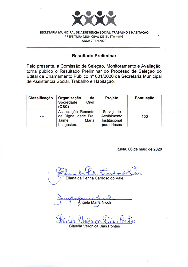 O MUNICÍPIO DE ITUETA, situado na Praça Antônio Barbosa de Castro, nº. 35, Centro, CEP nº. 35.220-000, por intermédio da Secretaria Municipal de Assistência Social, Trabalho e Habitação, com esteio na Lei Federal nº 13.019, de 31 de julho de 2014 e na Lei Federal nº. 10.741, de 01 de outubro de 2003 - Estatuto de Idoso, torna público o RESULTADO PRELIMINAR do Edital de Chamamento Público visando à seleção de propostas de Organizações da Sociedade Civil interessadas em celebrar Termo de Colaboração que tem por objeto o acolhimento institucional da pessoa idosa e promover e articular ações de defesa de direitos, prevenção, orientações, prestações de serviços e apoio à família, direcionadas à melhoria da qualidade de vida da pessoa idosa com as atividades relacionadas nesse edital.