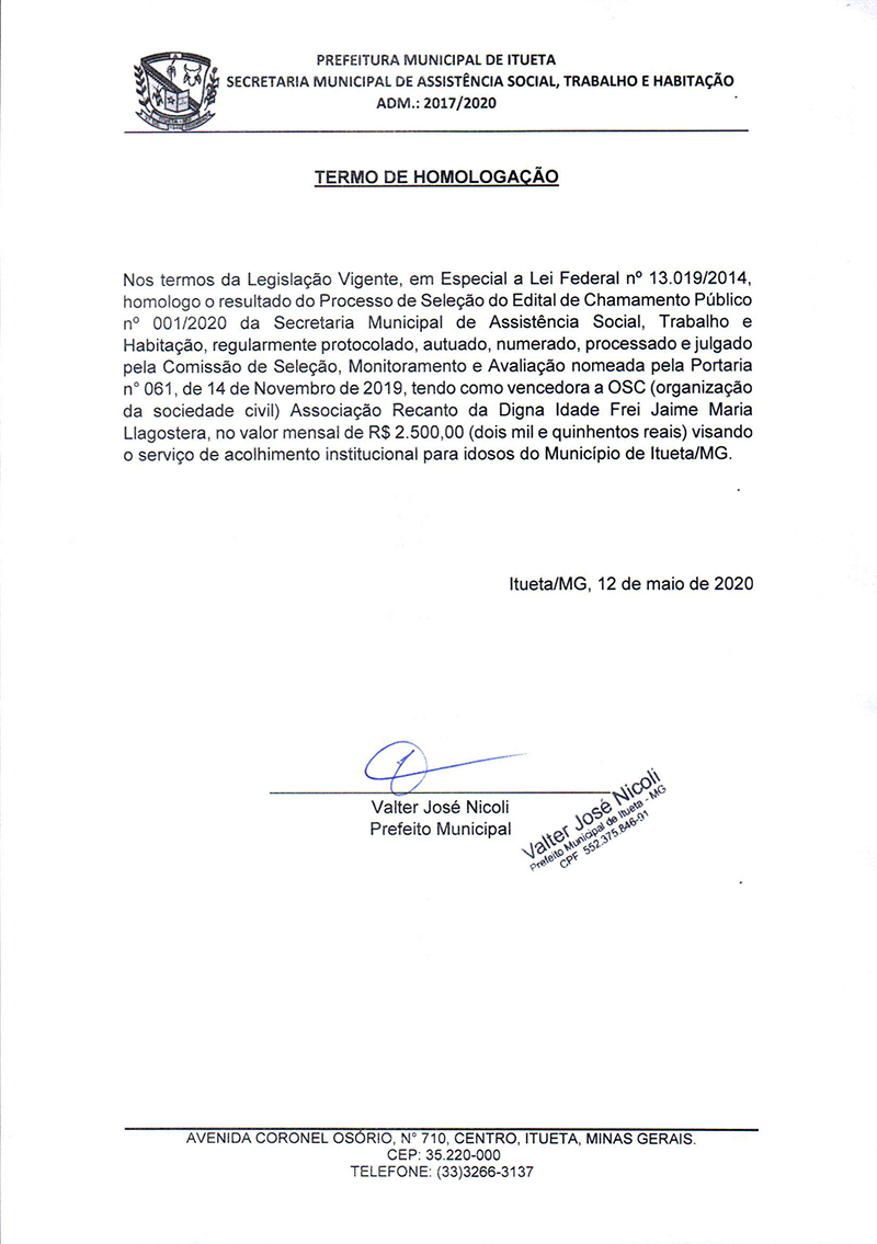 O MUNICÍPIO DE ITUETA, situado na Praça Antônio Barbosa de Castro, nº. 35, Centro, CEP nº. 35.220-000, por intermédio da Secretaria Municipal de Assistência Social, Trabalho e Habitação, com esteio na Lei Federal nº 13.019, de 31 de julho de 2014 e na Lei Federal nº. 10.741, de 01 de outubro de 2003 - Estatuto de Idoso, torna público o TERMO DE HOMOLOGAÇÃO do Edital de Chamamento Público visando à seleção de propostas de Organizações da Sociedade Civil interessadas em celebrar Termo de Colaboração que tem por objeto o acolhimento institucional da pessoa idosa e promover e articular ações de defesa de direitos, prevenção, orientações, prestações de serviços e apoio à família, direcionadas à melhoria da qualidade de vida da pessoa idosa com as atividades relacionadas nesse edital.