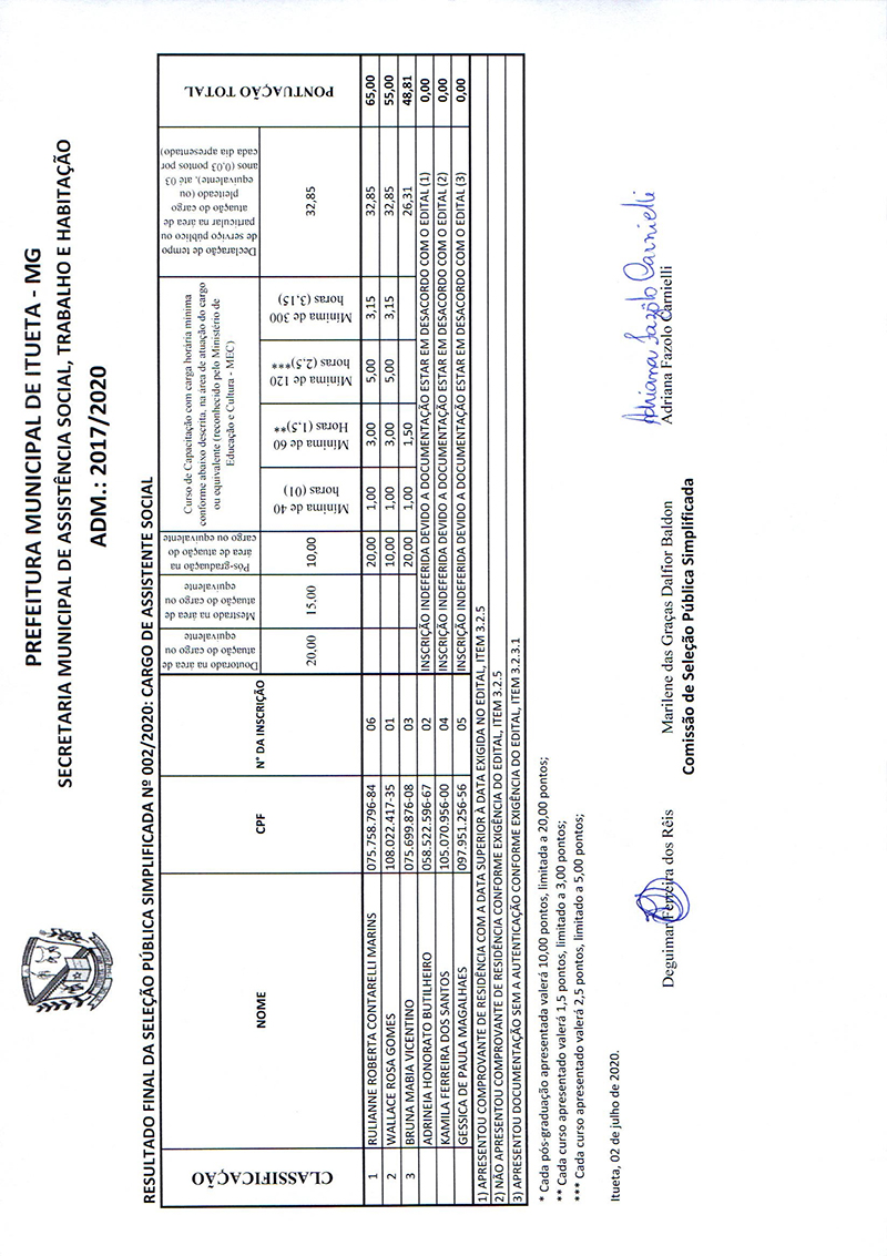 A Prefeitura Municipal de Itueta/MG, situada na Praça Antônio Barbosa de Castro, nº. 35, Centro, CEP nº. 35.220-000, por intermédio da Secretaria Municipal de Assistência Social, Trabalho e Habitação, no uso de suas atribuições legais, conferidas pela Lei Orgânica Municipal e Lei Complementar Municipal nº 002, de 04/04/2011, TORNA PÚBLICO, o RESULTADO FINAL das inscrições para o processo de SELEÇÃO PÚBLICA SIMPLIFICADA, para provimento de vagas existentes de acordo com o requisito da Lei Complementar n° 10/97, alterada pela Lei Municipal nº 16/98, do Município de Itueta/MG, relacionadas no edital.