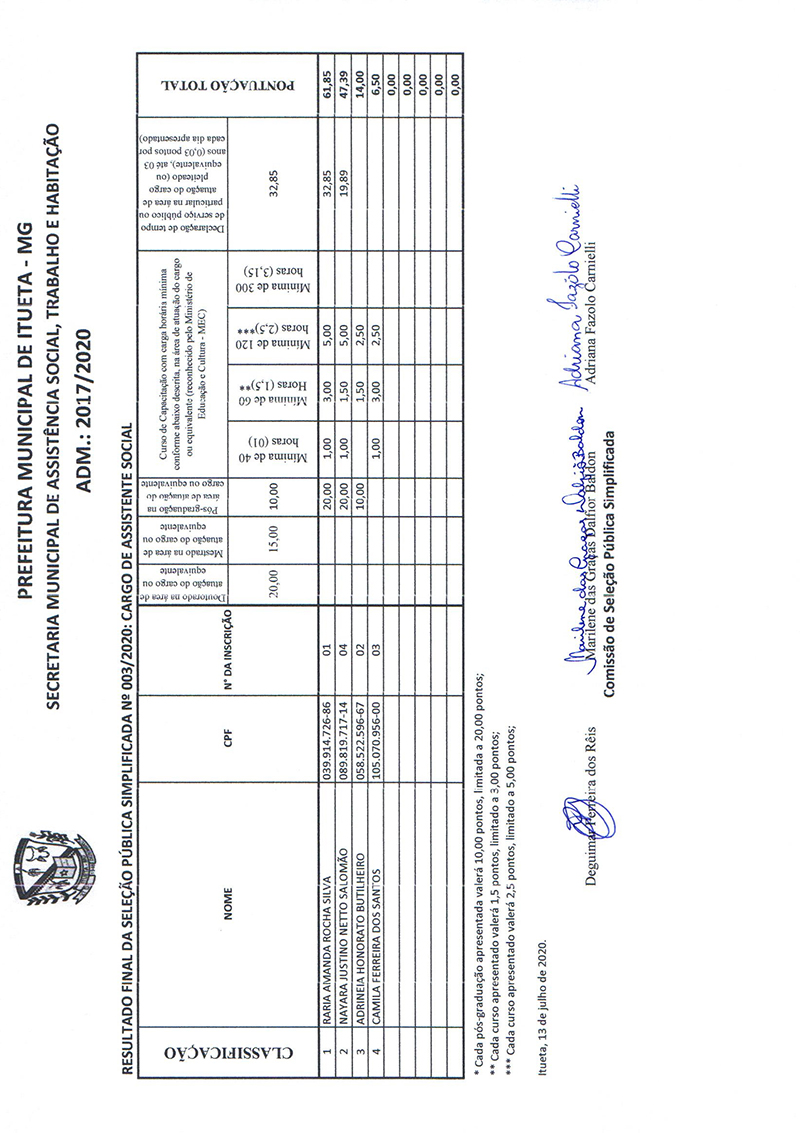Resultado Final - Seleção Pública Simplificada nº 03/2020