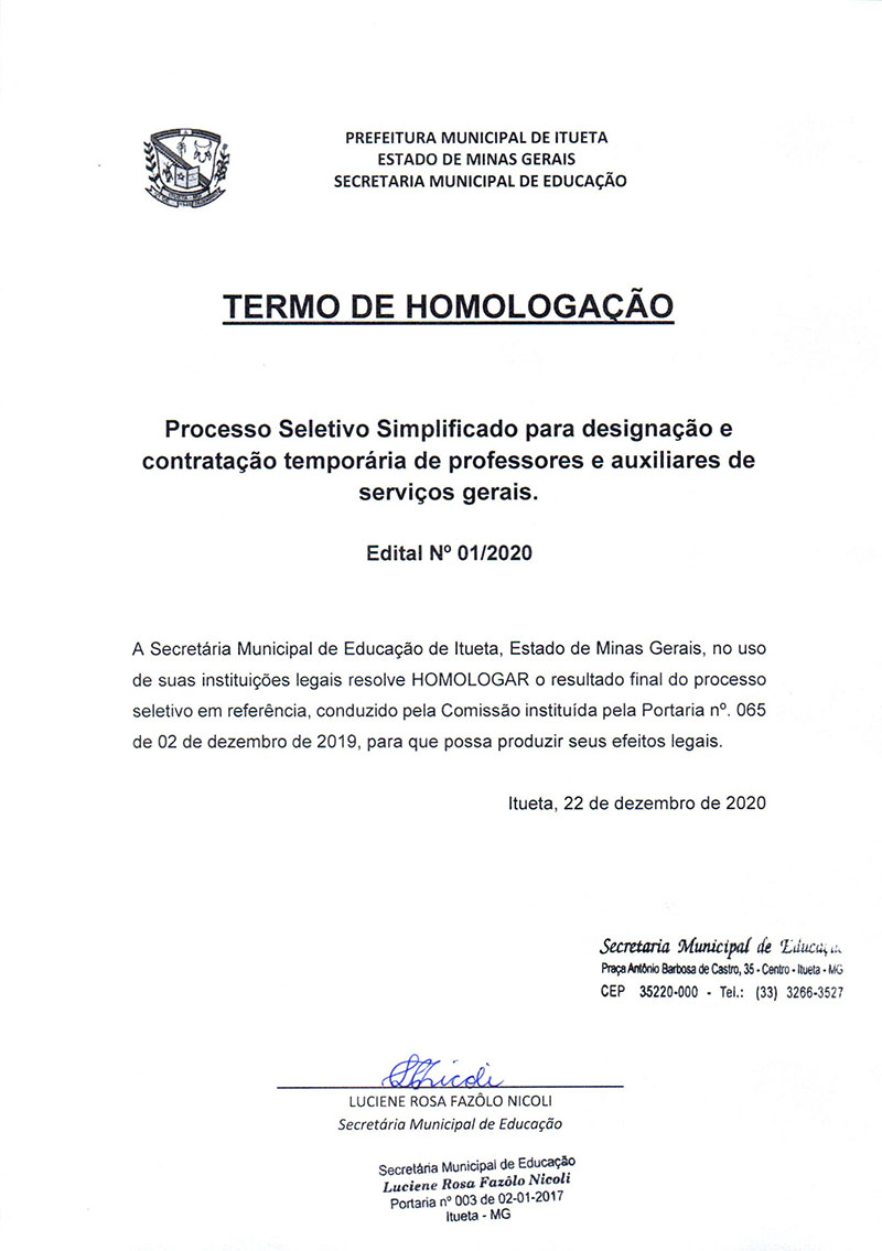 A Secretária Municipal de Educação de Itueta – Minas Gerais, no uso de suas atribuições legais resolve HOMOLOGAR o resultado final do processo seletivo em referência, conduzido pela Comissão instituída pela Portaria nº 065 de 02 de dezembro de 2019, para que possa produzir seus efeitos legais.