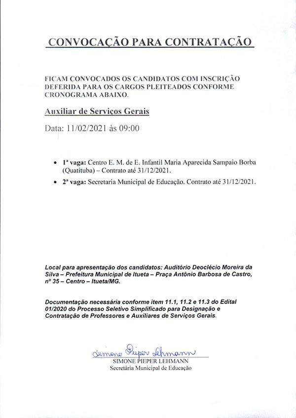CONVOCAÇÃO PARA CONTRATAÇÃO - Processo Seletivo Simplificado - Edital nº 01/2020