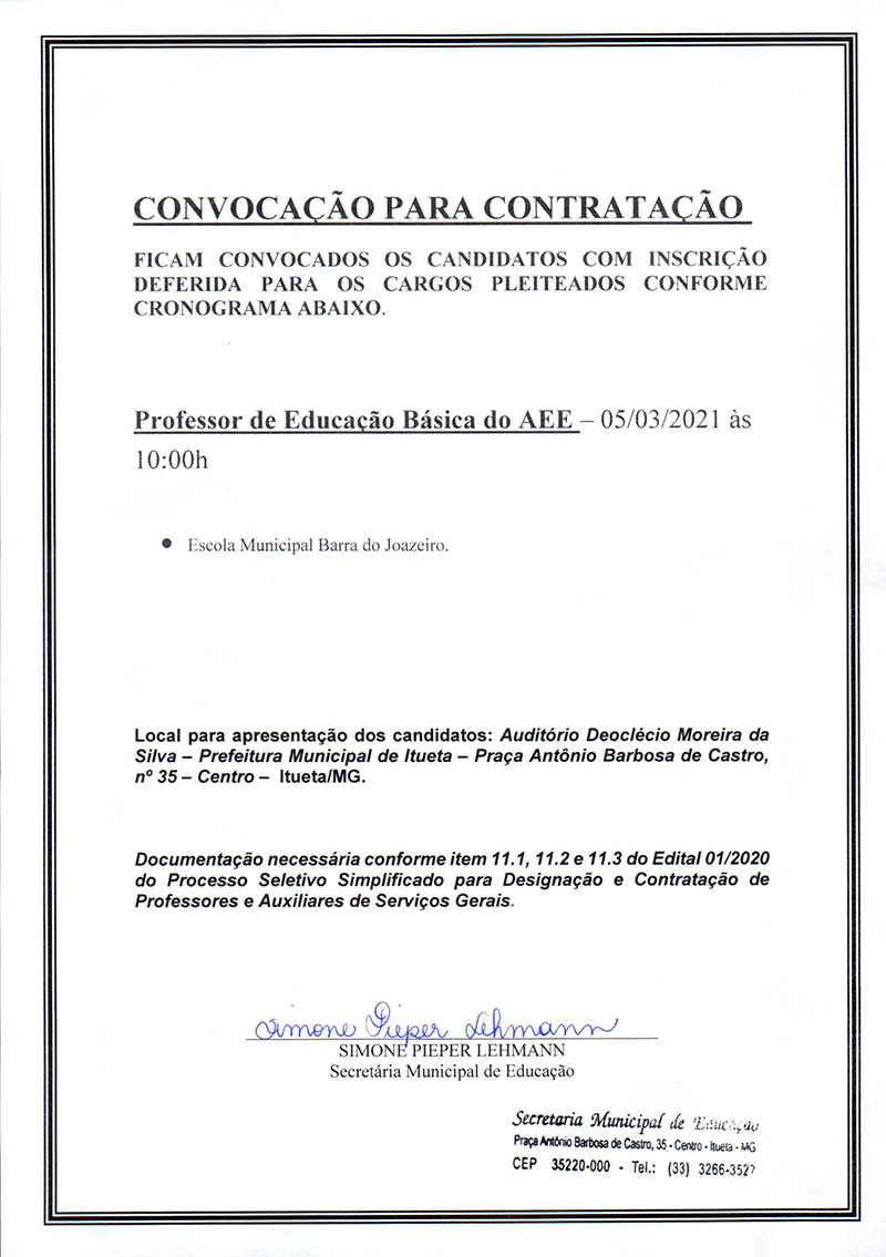 CONVOCAÇÃO PARA CONTRATAÇÃO (Professor de Educação Básica do AEE) - Processo Seletivo Simplificado - Edital nº 01/2020
