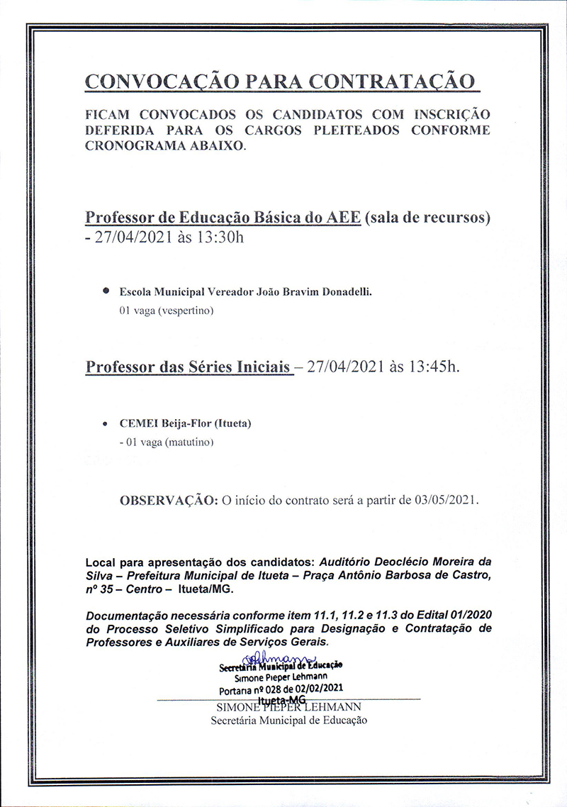 CONVOCAÇÃO PARA CONTRATAÇÃO (Professores PEB e PSI) - Processo Seletivo Simplificado - Edital nº 01/2020