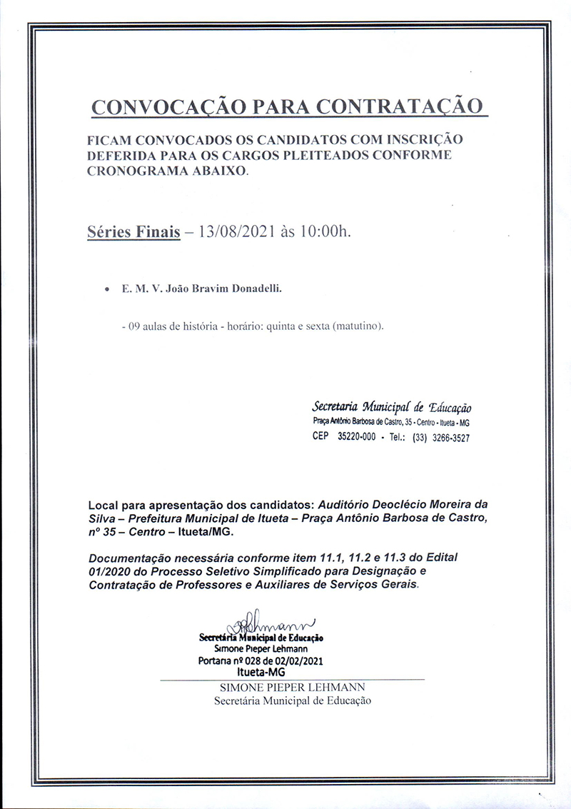 CONVOCAÇÃO PARA CONTRATAÇÃO (Séries Finais) - Processo Seletivo Simplificado - Edital nº 01/2020