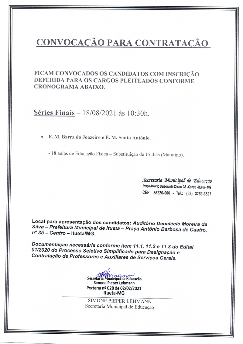 CONVOCAÇÃO PARA CONTRATAÇÃO - SÉRIES FINAIS - 18 AULAS DE EDUCAÇÃO FISICA