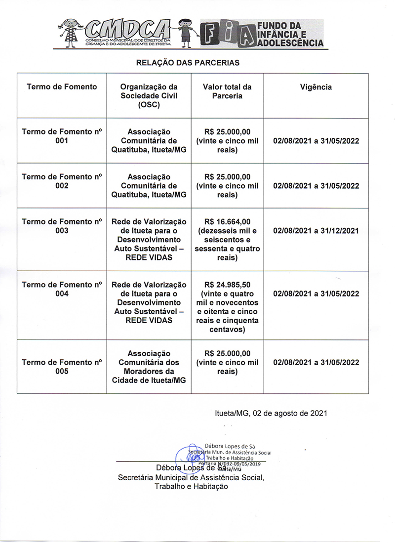 MUNICÍPIO DE ITUETA, situado na Praça Antônio Barbosa de Castro, nº. 35, Centro, CEP nº. 35.220-000, por intermédio da Secretaria Municipal de Assistência Social, Trabalho e Habitação - Conselho Municipal dos Direitos da Criança e do Adolescente - CMDCA, com esteio na Lei Federal nº 13.019, de 31 de julho de 2014, torna público a presente RELAÇÃO DE PARCERIAS do Edital de Chamamento Público, das Organizações da Sociedade Civil que celebraram Termo de Fomento que tem por objeto a execução de projetos com as atividades relacionadas no edital 001/2020.