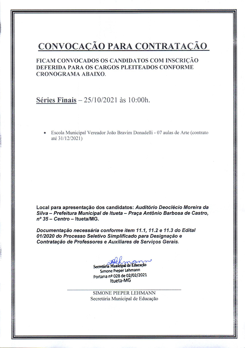 CONVOCAÇÃO PARA CONTRATAÇÃO - Processo Seletivo Simplificado - Edital nº 01/2020 - (07 aulas de Arte)