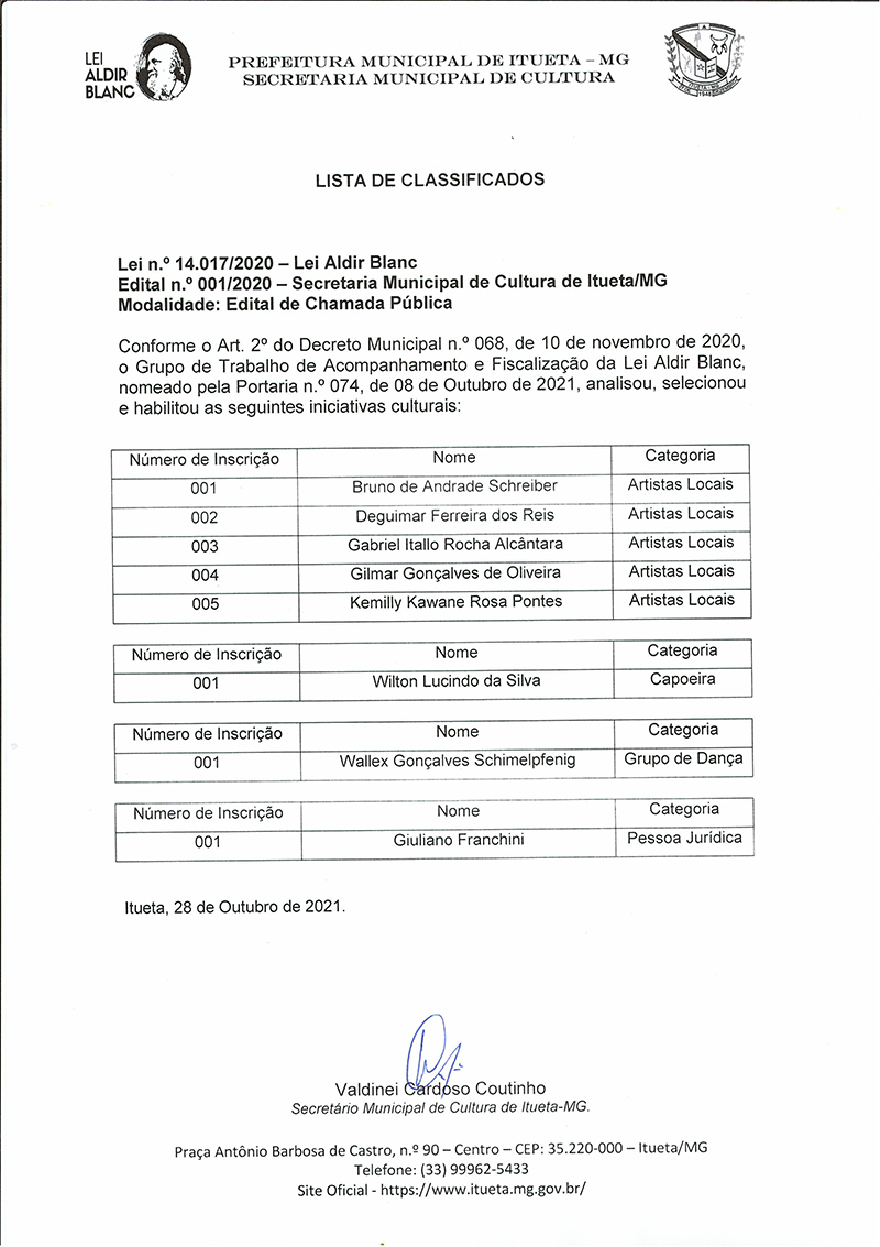A SECRETARIA MUNICIPAL DE CULTURA DO MUNICÍPIO DE ITUETA, divulga a lista de classificados do Edital de Chamamento Público 001/2020, recursos provenientes dos mecanismos de financiamento público previstos na Lei Federal nº 14.017, de 29 de junho de 2020 (Lei Aldir Blanc).