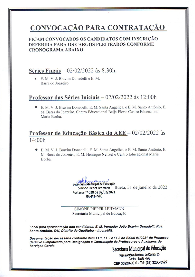 Página inicial > Últimas Notícias > CONVOCAÇÃO PARA CONTRATAÇÃO - Séries Finais, Professor das Séries Iniciais e Professor de Educação Básica do AEE - Processo Seletivo Simplificado - Edital nº 01/2021