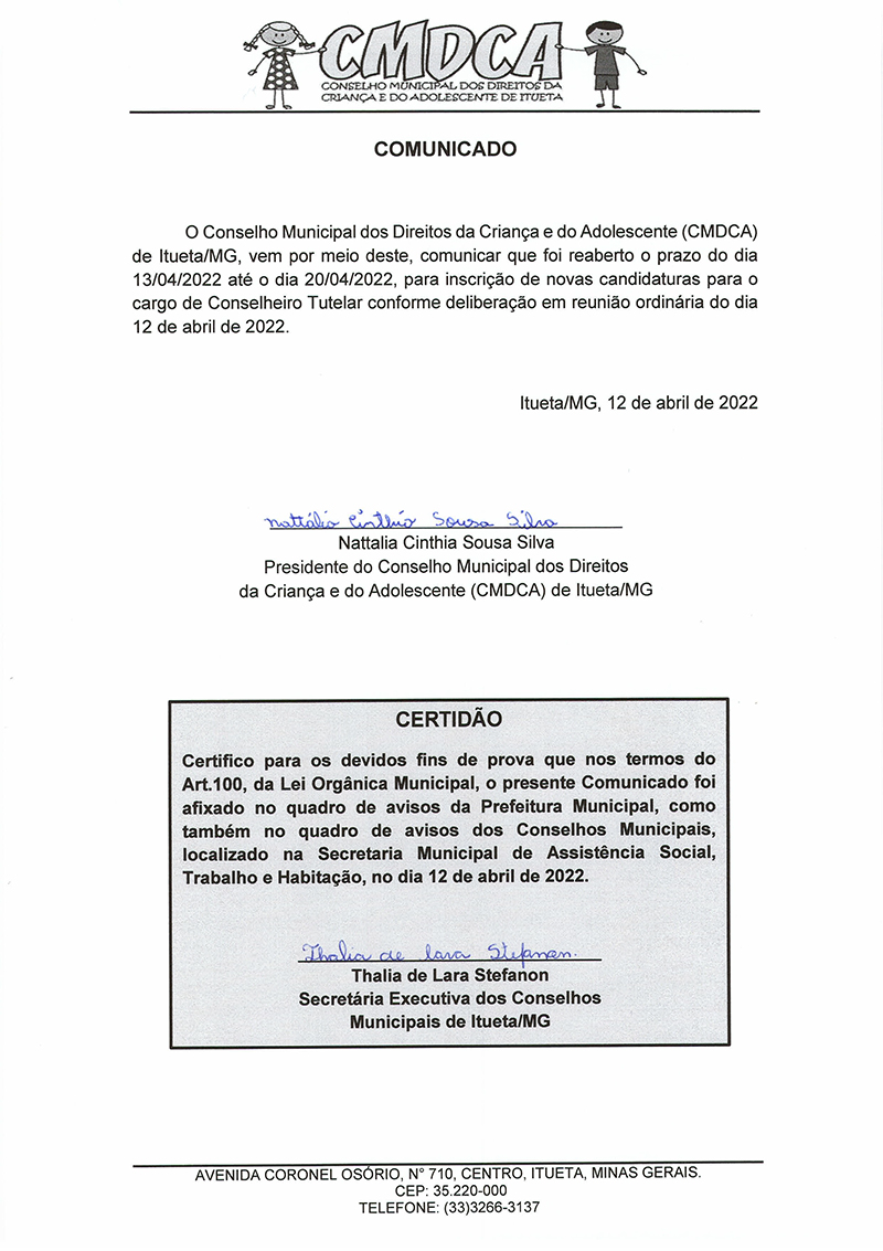 O Conselho Municipal dos Direitos da Criança e Adolescente (CMDCA) do Município de Itueta/MG , reabre prazo para inscrições no Processo de Escolha Suplementar para membros do Conselho Tutelar para o período 2022/2023.