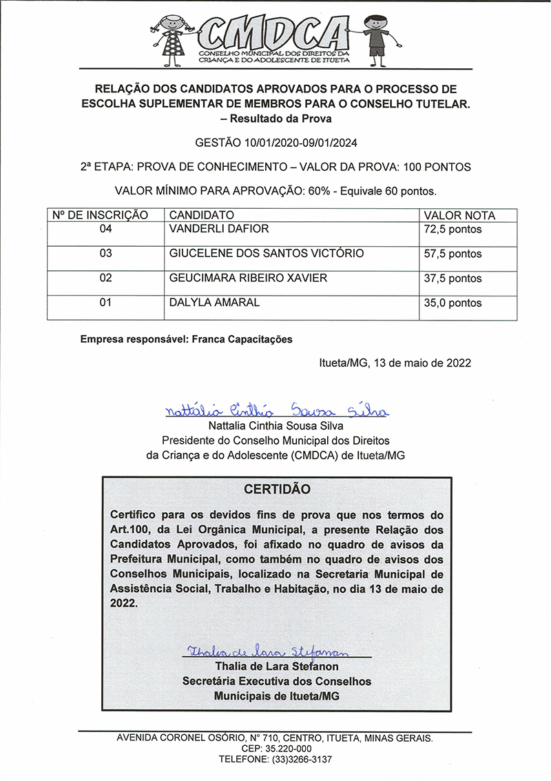 O Conselho Municipal dos Direitos da Criança e Adolescente (CMDCA) do Município de Itueta/MG, torna público o RESULTADO DA PROVA para o Processo de Escolha Suplementar para membros do Conselho Tutelar.