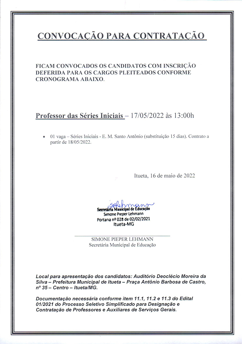 CONVOCAÇÃO PARA CONTRATAÇÃO - Professor das Séries Iniciais - Processo Seletivo Simplificado - Edital nº 01/2021