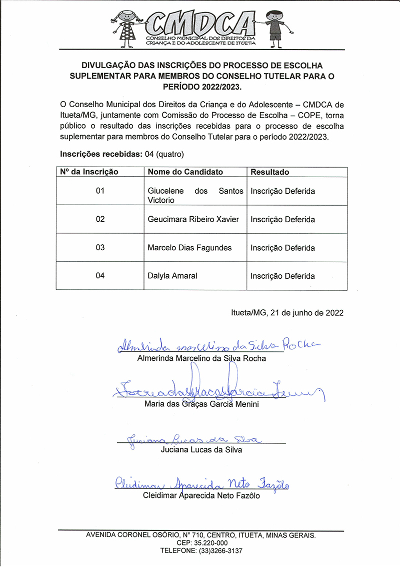 O Conselho Municipal dos Direitos da Criança e Adolescente (CMDCA) do Município de Itueta/MG, no uso de suas atribuições legais, conforme preconiza a Lei 8.069/90 - Estatuto da Criança e do Adolescente, a Lei Municipal nº 334/2019 e a Resolução nº 170/2014 do Conselho Nacional dos Direitos da Criança e do Adolescente - CONANDA torna público a Divulgação das Inscrições do Processo de Escolha Suplementar para membros do Conselho Tutelar para o período 2022/2023 sendo realizado sob a responsabilidade deste e a fiscalização do Ministério Público, mediante as condições estabelecidas no Edital.