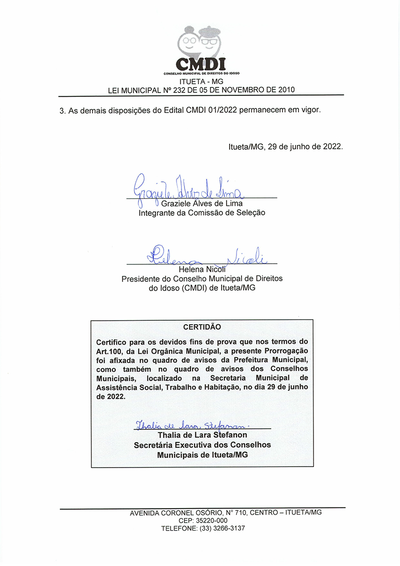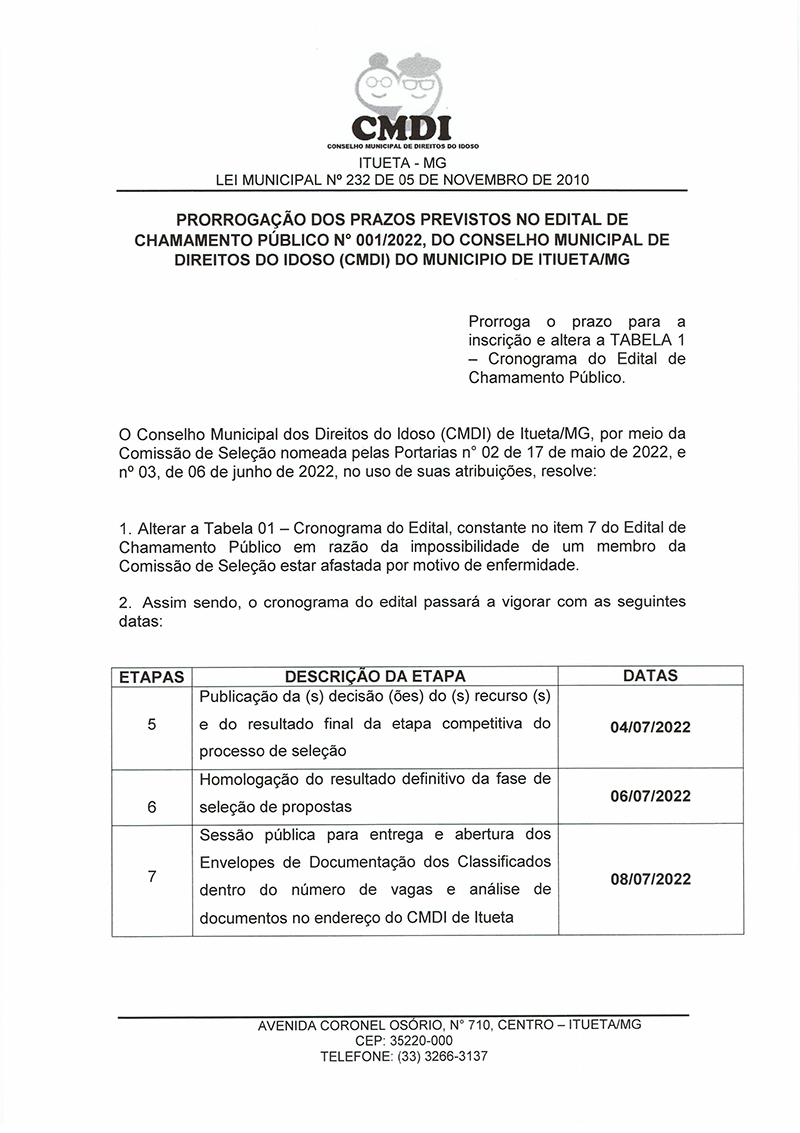 A PREFEITURA MUNICIPAL DE ITUETA-MG, por intermédio do Conselho Municipal de Direitos do Idoso – CMDI, com esteio na Lei Federal nº 13.019, de 31 de julho de 2014, torna público a PRORROGAÇÃO DOS PRAZOS do processo de seleção do Edital de Chamamento Público visando à seleção de propostas de organizações da sociedade civil interessadas em celebrar Termo de Fomento que tem por objeto a execução de projetos com as atividades relacionadas no edital.