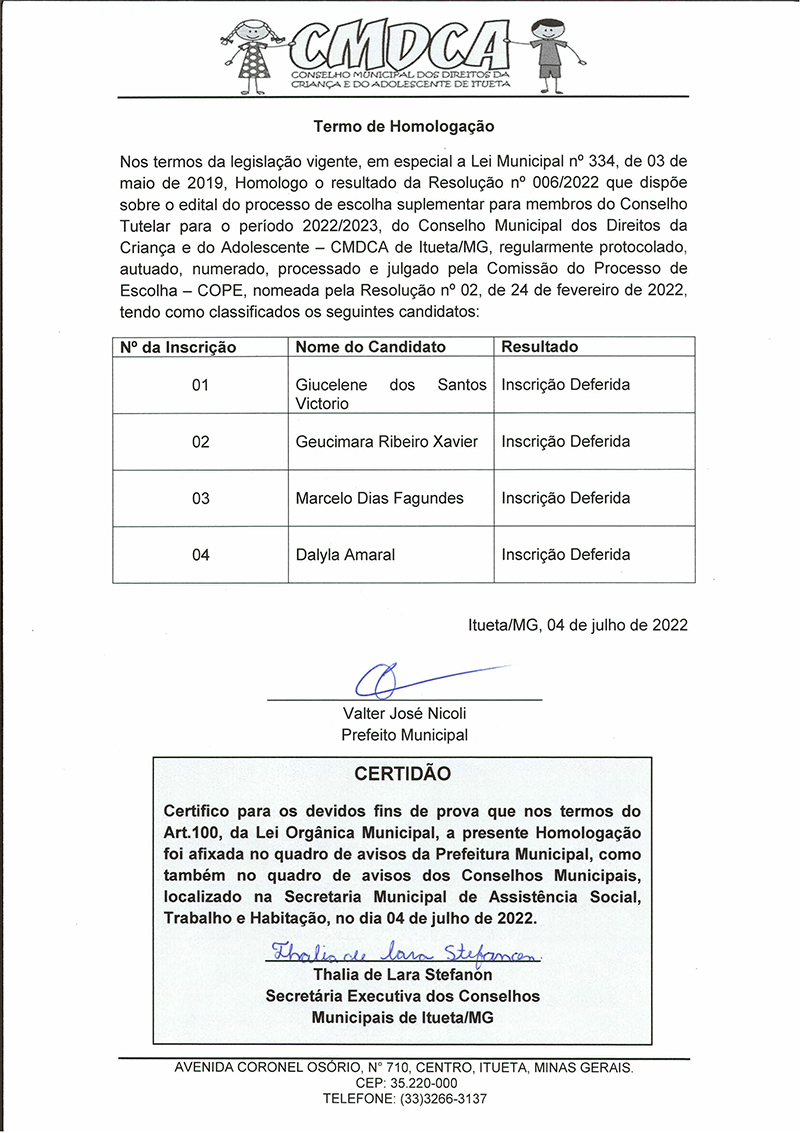O Conselho Municipal dos Direitos da Criança e Adolescente (CMDCA) do Município de Itueta/MG, no uso de suas atribuições legais, conforme preconiza a Lei 8.069/90 - Estatuto da Criança e do Adolescente, a Lei Municipal nº 334/2019 e a Resolução nº 170/2014 do Conselho Nacional dos Direitos da Criança e do Adolescente - CONANDA torna público o Termo de Homologação do Resultado das Inscrições do Processo de Escolha Suplementar para membros do Conselho Tutelar para o período 2022/2023 sendo realizado sob a responsabilidade deste e a fiscalização do Ministério Público, mediante as condições estabelecidas no Edital.