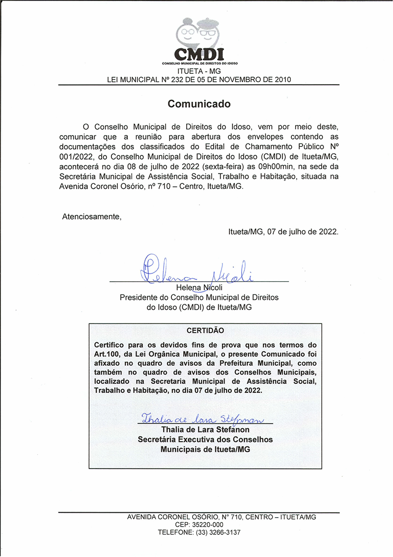 Página inicial > Últimas Notícias > Comunicado - Abertura dos envelopes - Edital de Chamamento Público 001/2022 (CMDI)