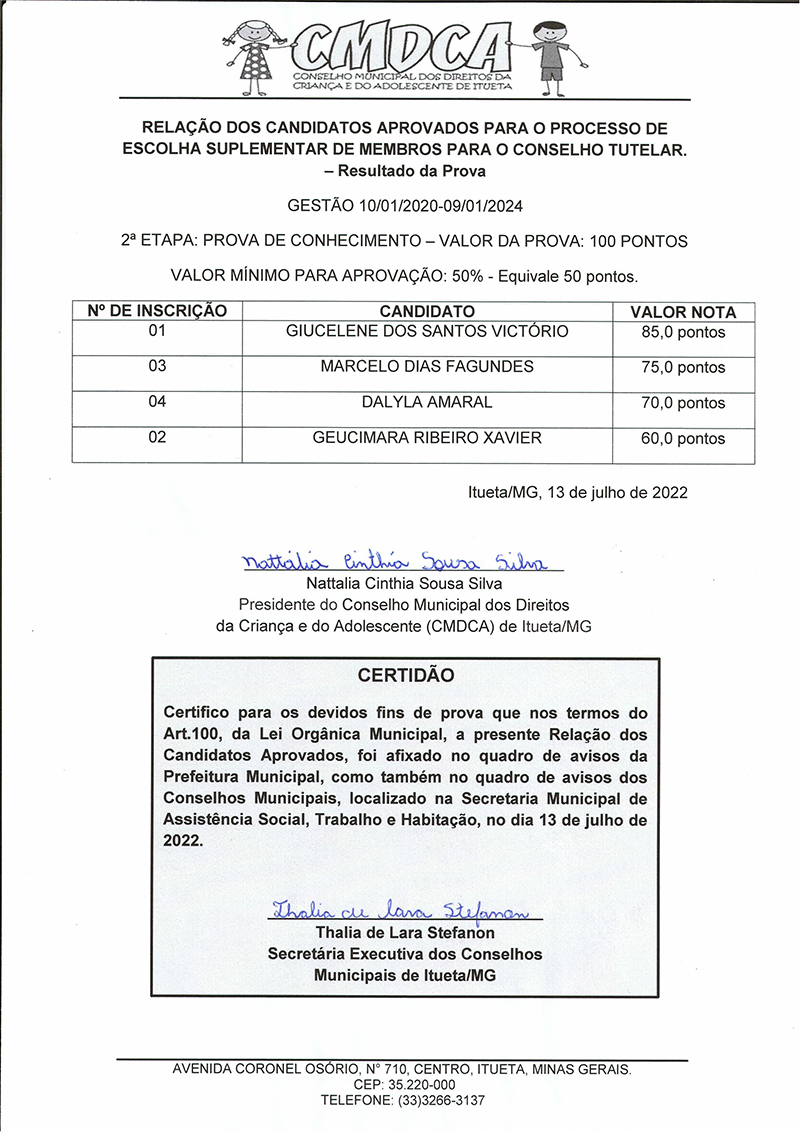O Conselho Municipal dos Direitos da Criança e Adolescente (CMDCA) do Município de Itueta/MG, no uso de suas atribuições legais, conforme preconiza a Lei 8.069/90 - Estatuto da Criança e do Adolescente, a Lei Municipal nº 334/2019 e a Resolução nº 170/2014 do Conselho Nacional dos Direitos da Criança e do Adolescente - CONANDA torna público a RELAÇÃO DOS CANDIDATOS APROVADOS no Processo de Escolha Suplementar para membros do Conselho Tutelar para o período 2022/2023 sendo realizado sob a responsabilidade deste e a fiscalização do Ministério Público, mediante as condições estabelecidas no Edital.