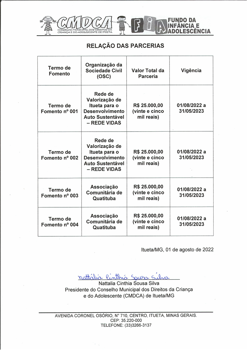 O MUNICÍPIO DE ITUETA, situado na Praça Antônio Barbosa de Castro, nº. 35, Centro, CEP nº. 35.220-000, por intermédio da Secretaria Municipal de Assistência Social, Trabalho e Habitação - Conselho Municipal dos Direitos da Criança e do Adolescente - CMDCA, com esteio na Lei Federal nº 13.019, de 31 de julho de 2014, torna público a presente RELAÇÃO DE PARCERIAS do Edital de Chamamento Público, das Organizações da Sociedade Civil que celebraram Termo de Fomento que tem por objeto a execução de projetos com as atividades relacionadas no edital 001/2021.